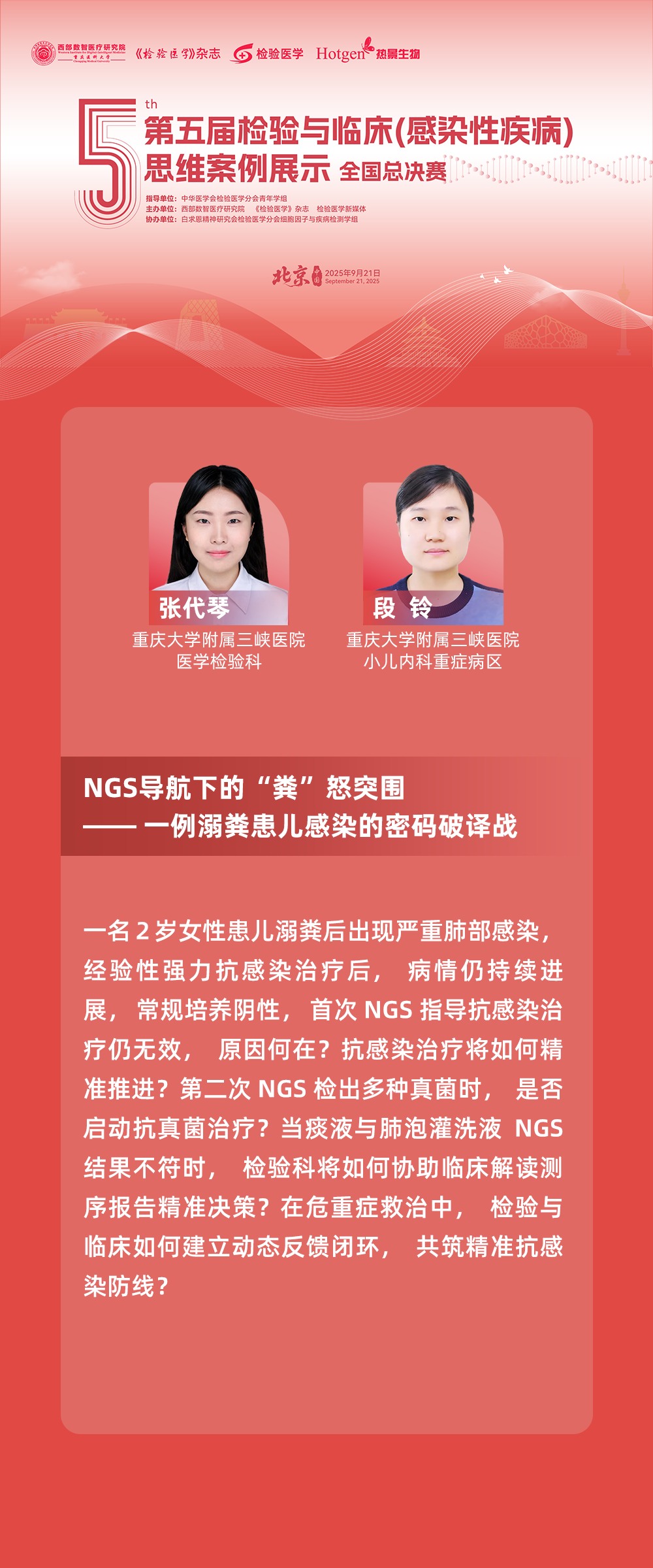 為了更有效地推進(jìn)檢驗(yàn)與臨床之間的溝通,促進(jìn)跨學(xué)科交流與合作,實(shí)現(xiàn)檢驗(yàn)與臨床的融合發(fā)展,在大會(huì)召開(kāi)期間,舉辦了檢驗(yàn)與臨床思維案例展示活動(dòng)暨“2025年全國(guó)檢驗(yàn)與臨床思維案例展示總決賽”。其中,由熱景生物支持的“第五屆檢驗(yàn)與臨床(感染性疾?。┧季S案例展示全國(guó)總決賽”冠軍組案例,即來(lái)自遵義市第一人民醫(yī)院的《“三低一高”矛盾體,一例細(xì)小病毒(B19)感染導(dǎo)致的純紅細(xì)胞再生障礙性貧血》、重慶大學(xué)附屬三峽醫(yī)院的《NGS導(dǎo)航下的“糞”怒突圍——一例溺糞患兒感染的密碼破譯戰(zhàn)》案例入選“2025年全國(guó)檢驗(yàn)與臨床思維案例展示總決賽”。